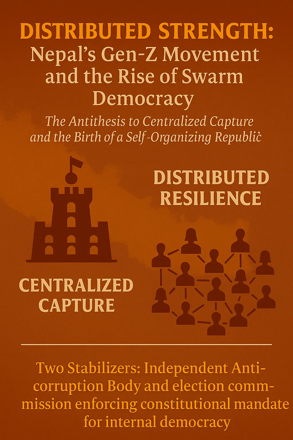धेरै पर्यवेक्षकहरूले नेपालको जेनजी घटनालाई खण्डित – अर्थात् खुकुलो रूपमा जोडिएका समूहहरूको झुण्ड, जसले आ–आफ्नै एजेन्डा पछ्याइरहेका छन् – भनेर व्याख्या गर्छन्। तैपनि, अर्को दृष्टिकोणबाट हेर्दा, यसले लचिलोपनको नयाँ वास्तुकलाको प्रतिनिधित्व गर्न सक्छ – जुन विगतका पदानुक्रमहरू भन्दा फरक तरिकाले काम गर्ने वितरित प्रणाली हो।