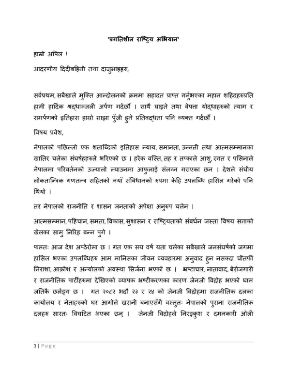 समयको यही आवाज र आवश्यकतालाई बुझेर देश तथा विदेशमा बस्नु हुने सम्पूर्ण वामपन्थी, प्रगतिशील, लोकतान्त्रिक र देशभक्त जनसमुदायहरुलाई ढिलो नगरी ’प्रगतिशील राष्ट्रिय अभियान’मा आवद्ध हुन जोडदार अपिल गर्दछौं ।