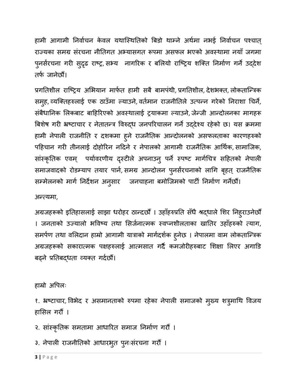 हामी आगामी निर्वाचन केवल यथास्थितिको बिडो थाम्ने अर्थमा नभई निर्वाचन पश्चात् राज्यका समग्र संरचना नीतिगत अभ्यासगत रूपमा असफल भएको अवस्थामा नयाँ जगमा पुनर्संरचना गरी सुदृढ राष्ट्र, सभ्य नागरिक र बलियो राष्ट्रिय शक्ति निर्माण गर्ने उद्देश तर्फ जानेछौं।