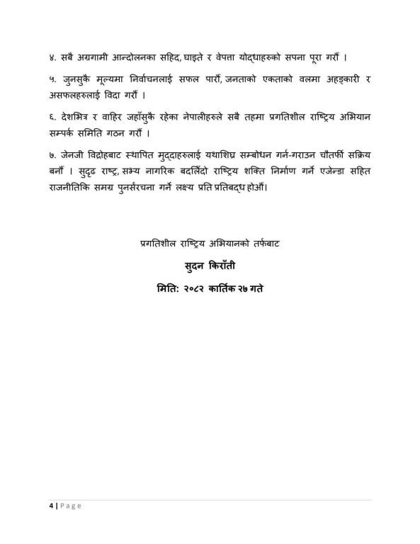 ७. जेनजी विद्रोहबाट स्थापित मुद्दाहरुलाई यथाशीघ्र सम्बोधन गर्न गराउन चौतर्फी सक्रिय बनौं । सुदृढ राष्ट्र सभ्य नागरिक बदलिँदो राष्ट्रिय शक्ति निर्माण गर्ने एजेण्डासहित राजनीतिकको समग्र पुनर्संरचना गर्ने लक्ष्यप्रति प्रतिबद्ध होऔं ।
