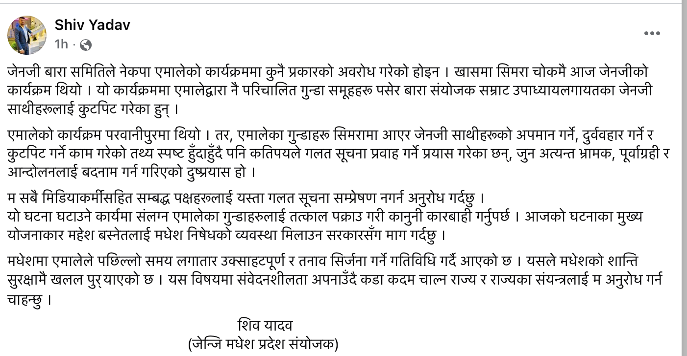 जेनजी मधेश प्रदेश संयोजक यादवले फेसबुकमा लेख्दै यो घटना एमालेको सुनियोजित षड्यन्त्र रहेको बताएका छन् ।
