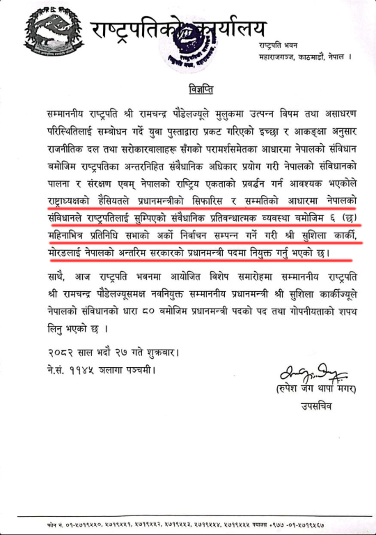 राष्ट्रपति कार्यालय शीतल निवासले भने भदौ २७ गते कार्कीलाई नियुक्ति दिँदा तत्कालीन प्रधानमन्त्रीको सिफारिस र सम्मति रहेको उल्लेख गरेको थियो । प्रधानमन्त्री नियुक्तिसम्बन्धी विज्ञप्तिमा राष्ट्रपति कार्यालयले भनेको छ,’। राष्ट्राध्यक्षको हैसियतले प्रधानमन्त्रीको सिफारिस र सम्मतिको आधारमा नेपालको संविधानले राष्ट्रपतिलाई सुम्पिएको संवैधानिक प्रतिवन्धात्मक व्यवस्था बमोजिम ६ ९छ० महिनाभित्र प्रतिनिधि सभाको अर्को निर्वाचन सम्पन्न गर्ने गरी श्री सुशिला कार्की, मोरङलाई नेपालको अन्तरिम सरकारको प्रधानमन्त्री पदमा नियुक्त गर्नु भएको छ । ‘