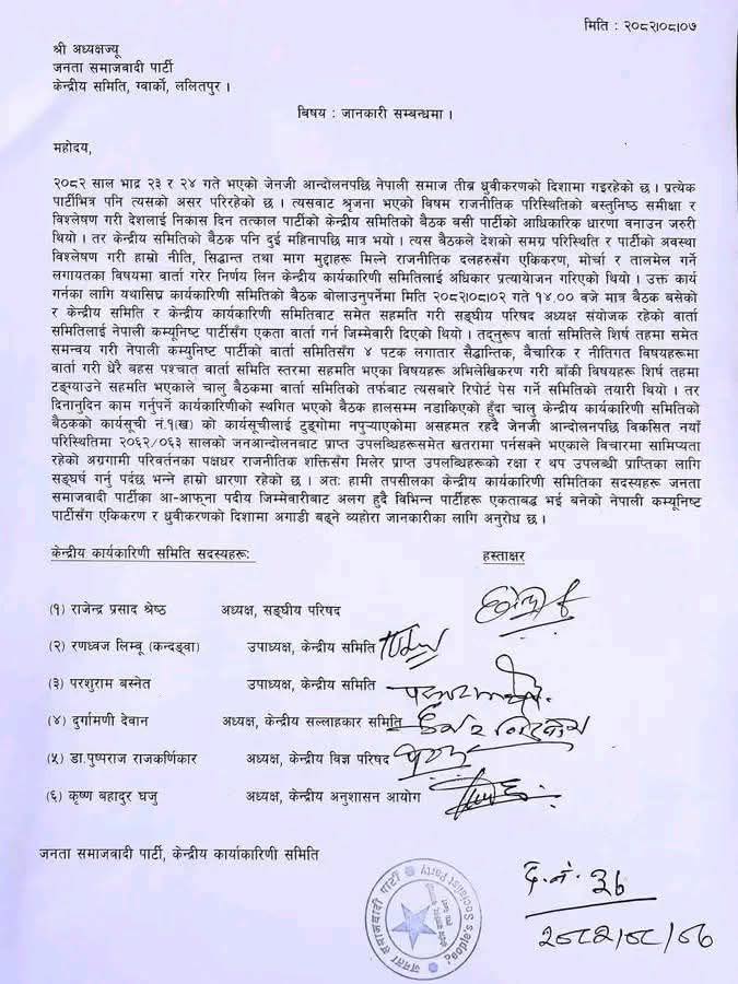 विभिन्न घटक मिलेर बनेको नेपाली कम्युनिष्ट पार्टीमा एकता र ध्रुविकरणका लागि भन्दै उनीहरुले आइतबार जसपा छाडेका हुन् । पार्टी छाड्नेहरुमा संघीय परिषद् अध्यक्ष श्रेष्ठ, उपाध्यक्ष रणध्वज लिम्बू कन्दङ्वा, परशुराम बस्नेत, केन्द्रीय सल्लाहकार समिति अध्यक्ष दुर्गामणी देवान, केन्द्रीय विज्ञ परिषद् अध्यक्ष पुष्पराज राजकर्णिकार, केन्द्रीय अनुशासन आयोगका अध्यक्ष कृष्णबहादुर धजु छन् ।