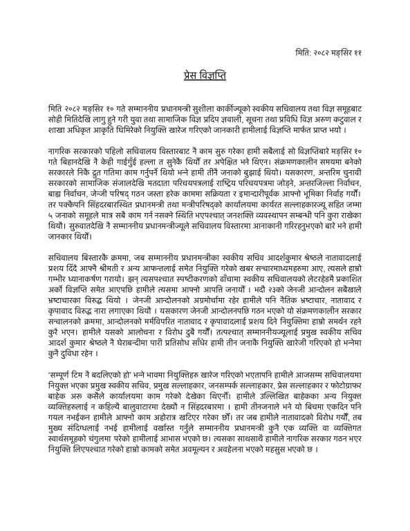This isn’t just office drama; it’s a microcosm of the Gen Z fire that birthed Karki’s interim reign—meant to purge cronyism, yet flirting with it. As Mangsir 2082 unfolds, with elections looming by Falgun and damage tallies from the Bhadra blaze still mounting, the youth whisper: Was the revolution outsourced, only to be undercut? Karki’s team insists on continuity, but the café chatter grows: In saving face, has she lost the plot? A satirical sting, perhaps, but one that demands a sequel—reform reloaded.
