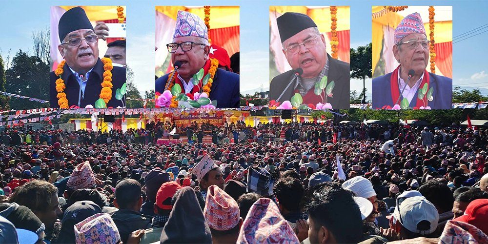 NCP Coordinator Pushpa Kamal Dahal Prachanda, along with Madhav Kumar Nepal, Jhalanath Khanal, Bamdev Gautam, Bhim Rawal, and others, devoted most of their addresses to criticizing rival parties — the CPN (UML) and Nepali Congress.