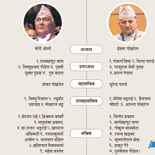 पार्टीको निर्वाचन आयोगले विभिन्न पदका लागि परेका उम्मेदवारहरूको सम्बन्धमा दाबी, विरोध, उजुरी र छानबिनपछि मंगलबार बिहान अन्तिम नामावली प्रकाशन गरेको हो।प्रकाशित नामावली अनुसार अध्यक्षमा केपी शर्मा ओली र ईश्वर पोखरेल उम्मेदवार छन्।