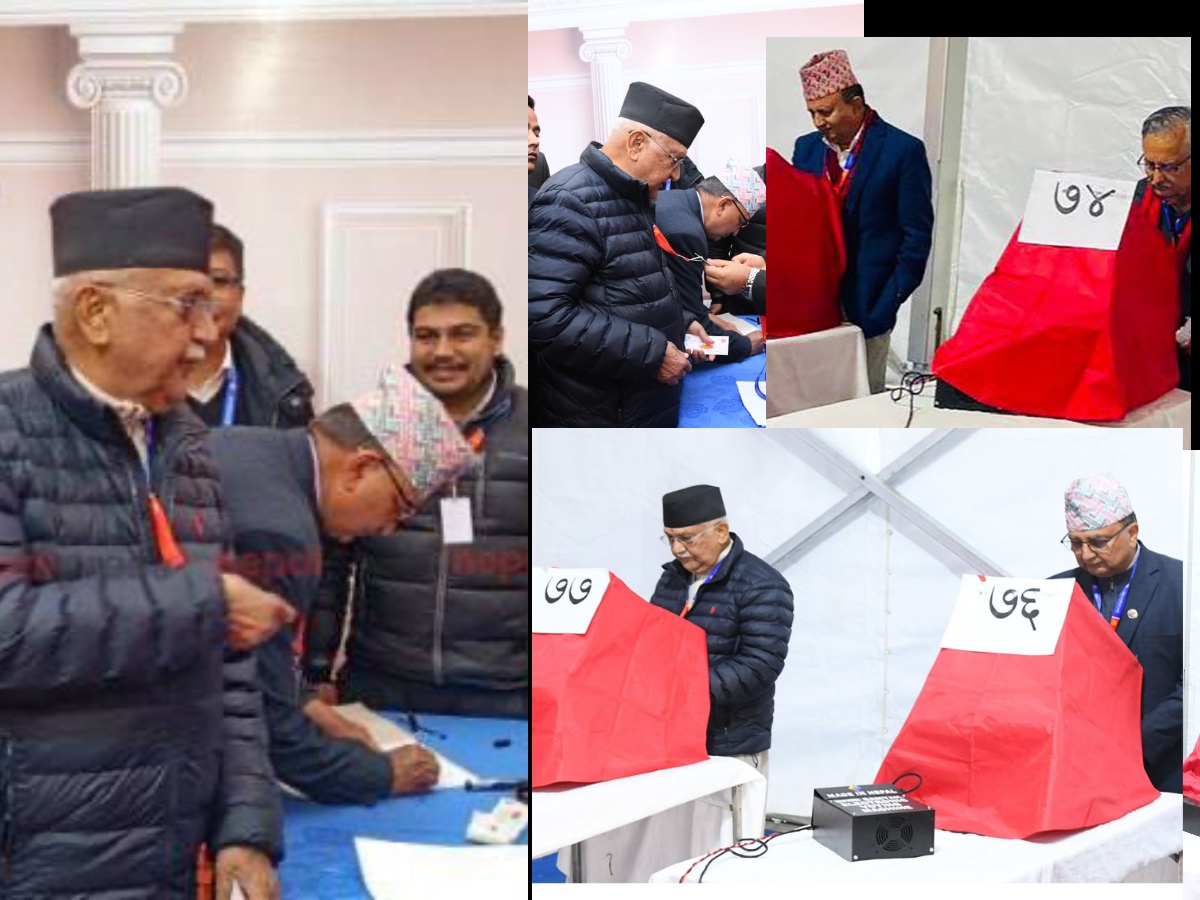- सुरुवात: अध्यक्षका दुवै उम्मेदवार ओली (मेसिन नं. ७७ बाट) र पोखरेल (मेसिन नं. ७६ बाट) ले मत हालेर मतदान प्रक्रिया सुरु गरेका छन्।
