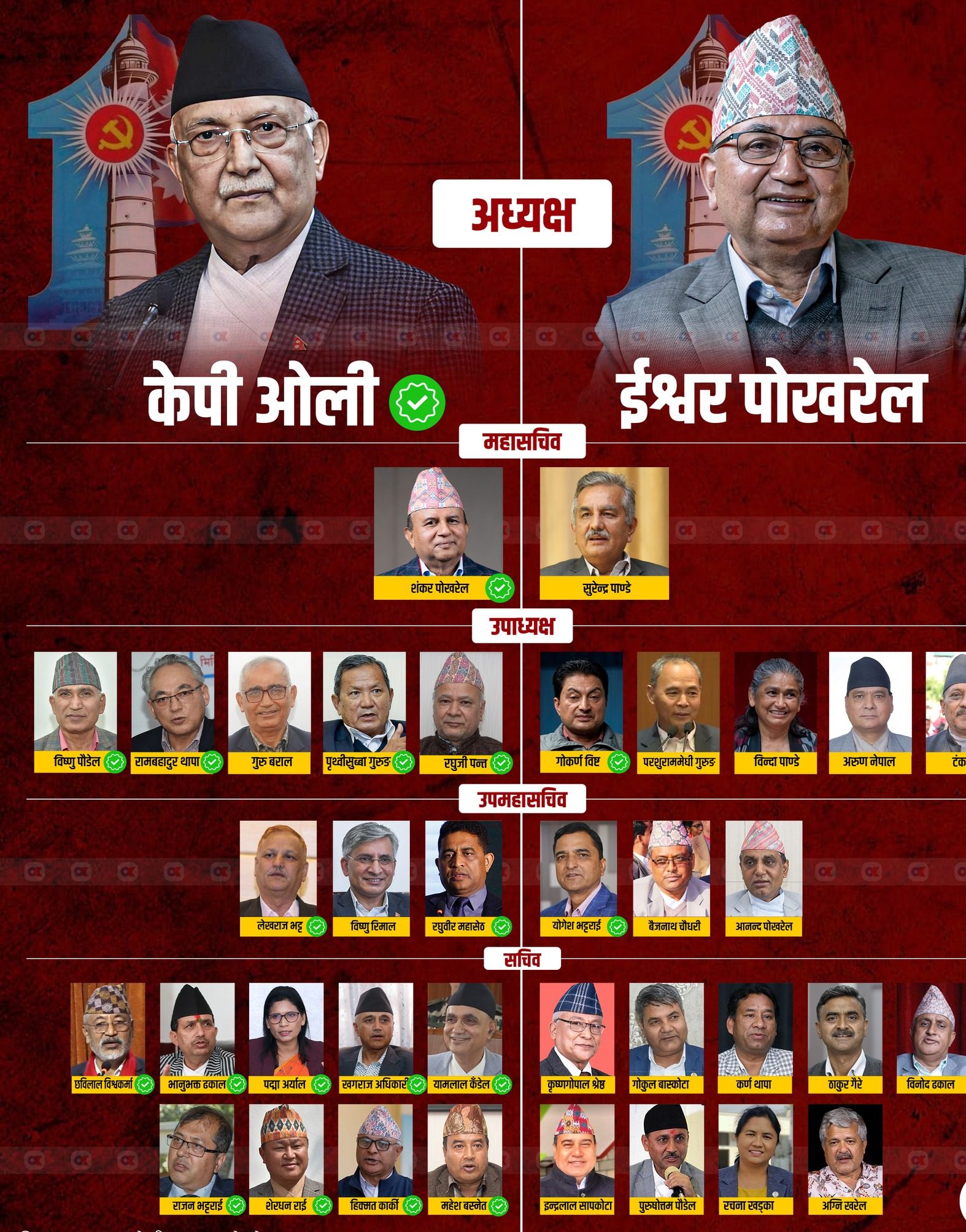 अध्यक्षमा ओलीले ह्याट्रिक गर्दा ईश्वर पोखरेल १०९९ मतले पराजित भएका छन् । १९ पदाधिकारीमा ओली समूहबाट १७ जना निर्वाचित हुँदा पोखरेल समूहबाट २ जना विजयी भएका छन् । पोखरेल समूहबाट उपाध्यक्षमा गोकर्ण बिष्ट र उपमहासचिवमा योगेश भट्टराई मात्र निर्वाचित हुँदा बाँकीमा ओली समूहमा उम्मेदवार विजयी भएका छन् ।