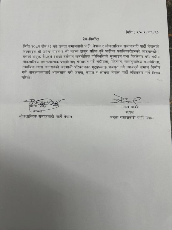 जनकपुरधाम १४ पुस: मधेशकेन्द्रित दुई प्रमुख दल जनता समाजवादी पार्टी (जसपा) नेपाललोकतान्त्रिक समाजवादी पार्टी (लोसपा) नेपाल बीच औपचारिक एकीकरणको निर्णय भएको छ। दुवै पार्टीका अध्यक्ष उपेन्द्र यादव (जसपा नेपाल) र महन्थ ठाकुर (लोसपा) सहितका पदाधिकारीहरूको काठमाडौंमा बसेको संयुक्त बैठकले यो ऐतिहासिक निर्णय गरेको हो। सहमति पत्रमा दुवै अध्यक्षले हस्ताक्षर गरेका छन्।