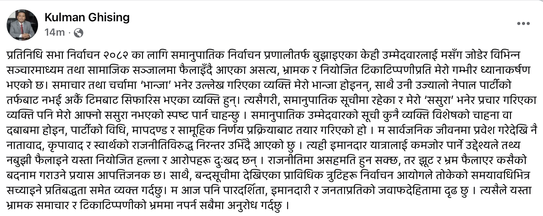 घिसिङले मंगलबार सामाजिक सञ्जाल फेसबुकमार्फत लामो स्टाटस लेख्दै विभिन्न सञ्चारमाध्यम र सामाजिक सञ्जालमा आफूसँग नाता जोडेर गरिएका टिप्पणीहरू असत्य, भ्रामक र नियोजित भएको बताएका हुन्।