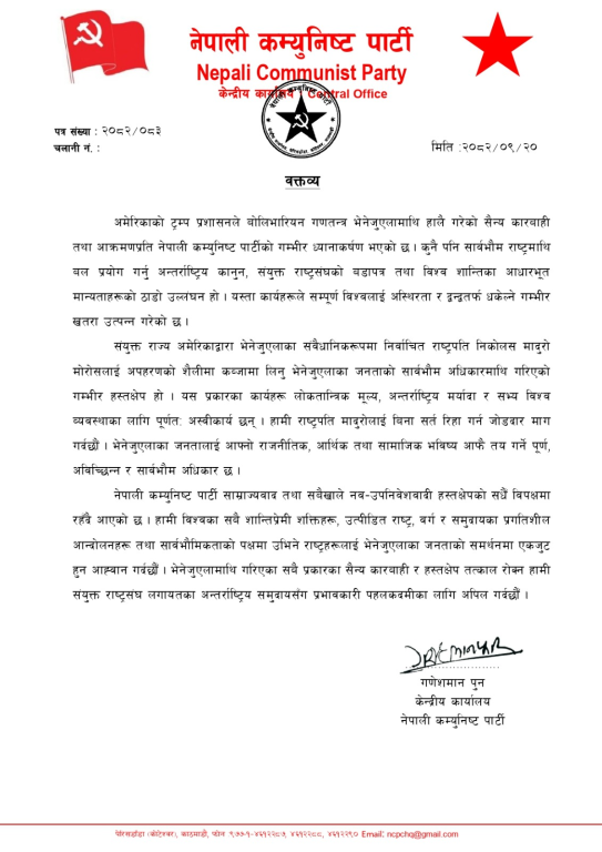 The Communist Party of Nepal (CPN) echoed these sentiments in an official statement, warning that such actions could plunge the world into instability and conflict. They deemed Maduro’s arrest an “abduction-style” infringement on Venezuelan people’s sovereign rights, demanding his unconditional release. “These actions are completely unacceptable for democratic values, international dignity, and a civilized world order,” the statement read.