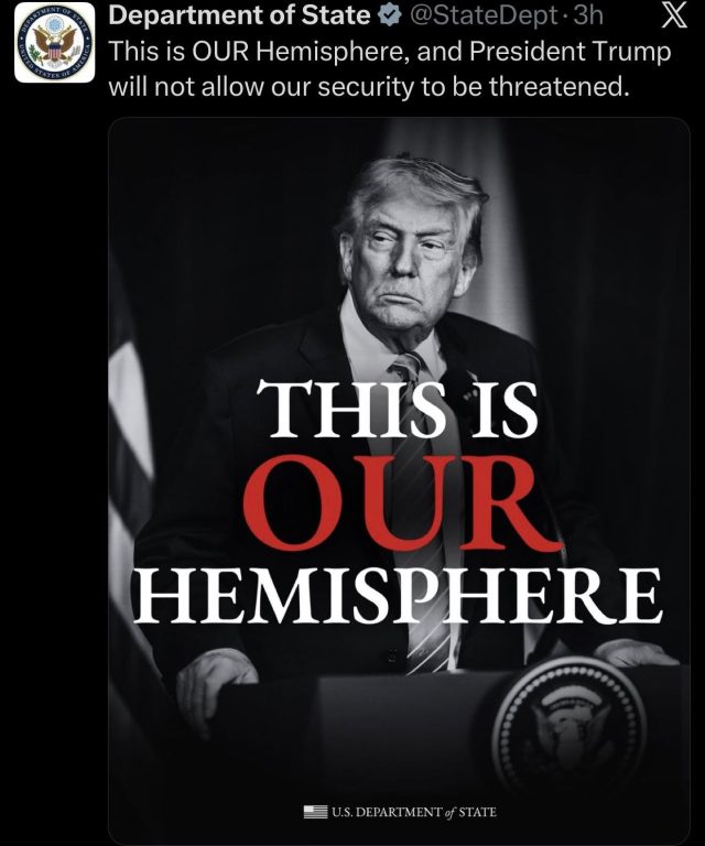 अमेरिकी विदेश विभागले यो कारबाहीलाई “कानुन प्रवर्तन अपरेसन” भने पनि, यसलाई ट्रम्पको “यो हाम्रो गोलार्ध हो” नीतिसँग जोडेर हेर्न थालिएको छ। विभागले एक्समा पोस्ट गरेको पोस्टरमा ट्रम्पको फोटोसँग “THIS IS OUR HEMISPHERE” लेखिएको छ, जसले पश्चिमी गोलार्धमा अमेरिकी प्रभुत्वको सन्देश दिन्छ।