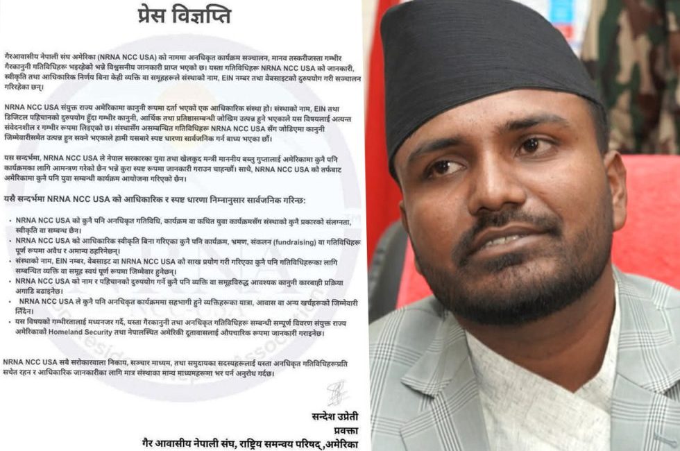 मन्त्री गुप्ताको अमेरिका भ्रमण स्वीकृत भएको समाचारपछि फर्जी निमन्त्रणा र सम्भावित मानव तस्करीजस्ता आरोपहरू उठेका छन्। यसै सन्दर्भमा एनआरएनए अमेरिकाले आफ्नो संस्थासँग जोडेर भइरहेका अनधिकृत गतिविधिप्रति गम्भीर ध्यानाकर्षण जनाउँदै यो विज्ञप्ति जारी गरेको हो।