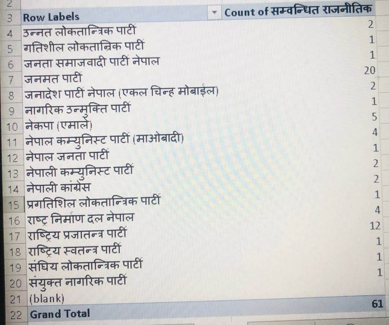काठमाडौं, २८ पुस । प्रतिनिधिसभा सदस्य निर्वाचनमा समानुपातिको बन्दसूचीबाट हालसम्म सबैभन्दा बढी जनमत पार्टीका २० जनाले आफ्नो नाम फिर्ता लिएका छन् ।त्यस्तै दोस्रो सबैभन्दा धेरै राष्ट्रिय प्रजातन्त्र पार्टीबाट १२ जनाले आफ्नो नाम फिर्ता लिएका छन् । नेकपा (एमाले) बाट पाँचजनाले आफ्नो नाम फिर्ता लिएका छन् ।आगामी फागुन २१ गते हुने प्रतिनिधिसभा सदस्य निर्वाचनका लागि सोमबार (पुस २८) मा समानुपातिकको बन्दसूचीबाट नाम फिर्ता लिने समय तोकिएको छ ।