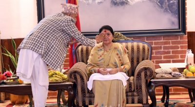 काठमाडौँ, १९ असोज । राष्ट्रपति विद्यादेवी भण्डारीले गुरूहरू देवराज अर्याल र खेमचन्द्र ढकालको हातबाट बडादसैँको