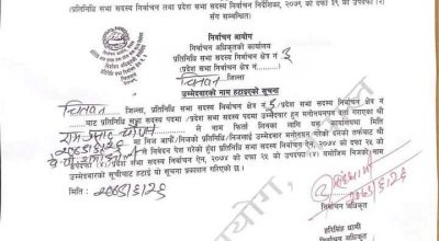 काठमाडौं, २७ असोज । आगामी मंसिर ४ गते हुने प्रतिनिधि सभा निर्वाचनको लागि उम्मेदवारी दिने काम