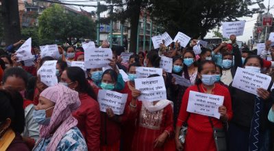 फुटपाथमा व्यापार गर्न पाउनुपर्ने माग गर्दै व्यापारीको प्रदर्शन (फोटो फिचर)
