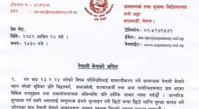 काठमाडौं २४ असोज । नेपाली सेनाले देशमा शान्ति सुरक्षा कायम लिन पहल लिएको बताएको छ।