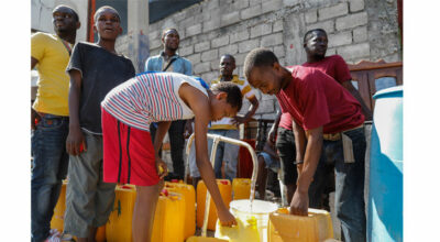 Haiti, Apr. 22: As the sun sets, a burly man bellows into a megaphone while a