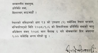 काठमाडौं ६ वैशाख । सरकारको सिफारिशमा राष्ट्रपति विद्यादेवी भण्डारीले संसदको चालु अधिवेशन अन्त्य गरेकिछिन् ।