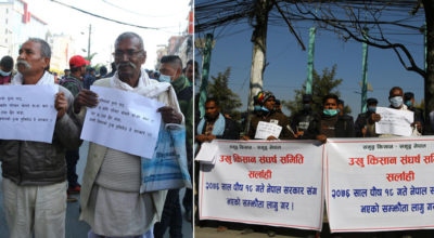 काठमाडौं, २८ मंसिर । आफ्नो पसिनाको मूल्य खोज्दै सर्लाहीका उखु किसानहरु राजधानी माइतीघर मण्डलामा प्रर्दशनमा