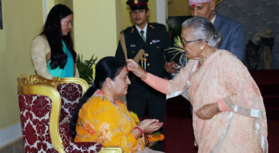 काठमाडौं १० कात्तिक । राष्ट्रपति विद्यादेवी भण्डारीले विजयादशमीका अवसरमा आज गुरु खेमचन्द्र ढकालबाट टीका ग्रहण