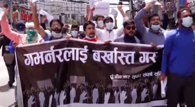 काठमाडौं, २१ भदौ । सेयर धितो कर्जा सीमाको विरोध गर्दै लगानीकर्ताहरुले नेपाल राष्ट्र बैंकका गभर्नर