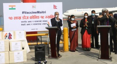 काठमाडौं । भारतबाट आज कोरोनाविरुद्धको थप १० लाख डोज खोप नेपाल आइपुगेको छ । कोरोनाविरुद्धको
