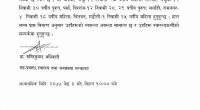 काठमाडौँ, ३ जेठ । पछिल्लो कोरोना परीक्षण रिपोर्टअनुसार थप दुई जनामा सङ्क्रमण पुष्टि भएको छ