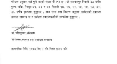 काठमाडौ, २ जेठ । नेपालमा थप ९ जनाको कोरोना भाइरस (कोभिड–१९) को संक्रमण देखिएको छ