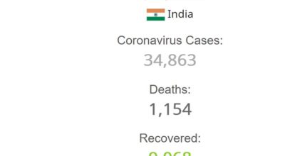 भारतमा कोरोना भाइरस संक्रमितको संख्या ३४ हजार ८ सय नाघ्यो, १ हजार १५४ को मृत्यु