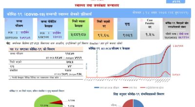 काठमाडौं । विगत २४ घण्टामा २ हजार ४ सय ७४ जनामा कोरोना भाइरस संक्रमण पुष्टि