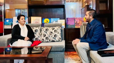 सञ्चारमन्त्री खरेल र पूर्वराष्ट्रपति भण्डारीबीच भेटवार्ता