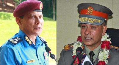 काठमाडौँ, १३ भदौ । नेपाल प्रहरीका महानिरीक्षक धिरजप्रताप सिंह र सशस्त्र प्रहरीका महानिरीक्षक राजु अर्याल