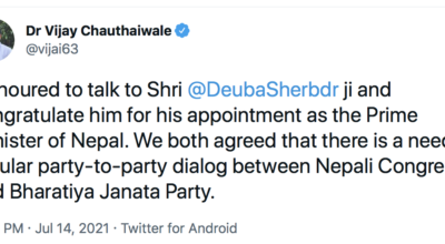 काठमाडौं । प्रधानमन्त्री शेरबहादुर देउवालाई भारतीय जनता पार्टीका विदेश विभाग प्रमुख विजय चौथाइवालेले बधाई दिएका