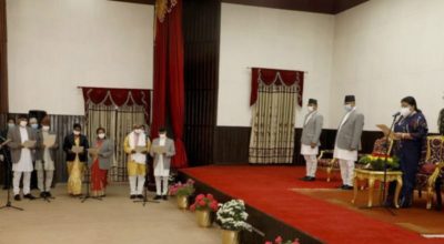 काठमाडौं । राष्ट्रपति विद्यादेवी भण्डारीसमक्ष नवनियुक्त मन्त्रीहरुले आज पद तथा गोपनीयताको शपथ लिएका छन् ।