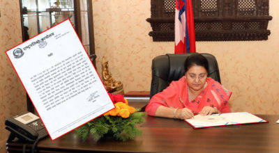 काठमाडौं, ५ पुष । राष्ट्रपति विद्यादेवी भण्डारीले संसद विघटन गरेकी छन् । प्रधानमन्त्री केपी शर्मा
