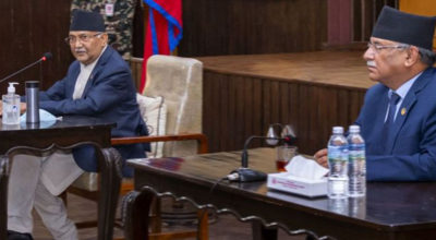 काठमाडौँ, १९ साउन । नेपाल कम्युनिष्ट पार्टी (नेकपा)का अध्यक्षद्धय केपी शर्मा ओली र पुष्पकमल दाहाल