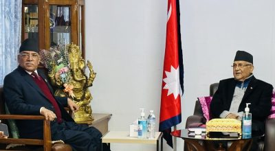 CPN-UML President KP Sharma Oli and Maoist Center member Pushpakamal Dahal Prachanda during a tea