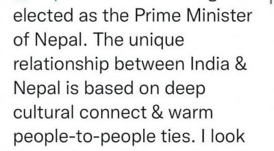 Kathmandu. The Indian counterpart has congratulated the newly appointed Prime Minister Pushpa Kamal Dahal Prachanda.