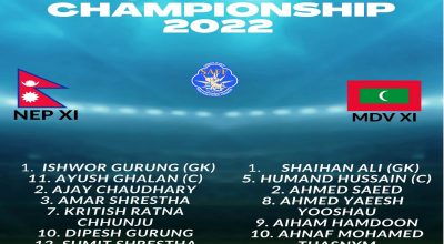 काठमाडौं, ९ साउन । यु-२० साफ च्याम्पियनसिपअन्तर्गत उद्घाटन खेलमा माल्दिभ्सविरुद्ध खेल्ने नेपाली टिमको सुरुवाती एघार